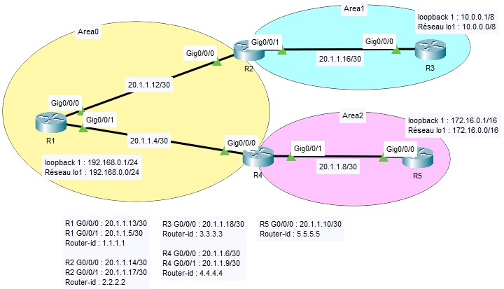 R2 (Type ABR – Chaque interface dans une area différente) :